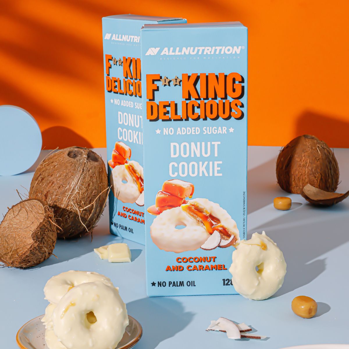 Allnutrition Fitking Delicious Donut sú sušienky bez pridaného cukru s lahodnou karamelovou náplňou a bez palmového oleja. Ideálna voľba pre každého, kto si chce užiť sladké bez výčitiek – láska na prvé zahryznutie!