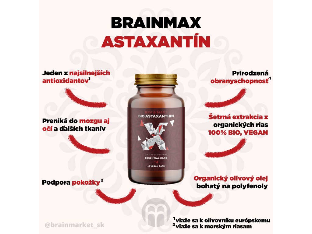 BrainMax Astaxanthin je v súčasnosti najsilnejší antioxidant objavený v prírode. Astaxantín extrahujú z ekologicky pestovaných rias Haematococcus pluvialis a obsahuje aj prirodzene sa vyskytujúce karotenoidy ako luteín, kantaxantín a beta-karotén. Organická výrobná technológia a testovanie na ťažké kovy zaisťujú maximálnu čistotu produktu. BIO kvalita astaxantínu garantuje až 50-krát vyššiu biologickú dostupnosť oproti syntetickej forme.
