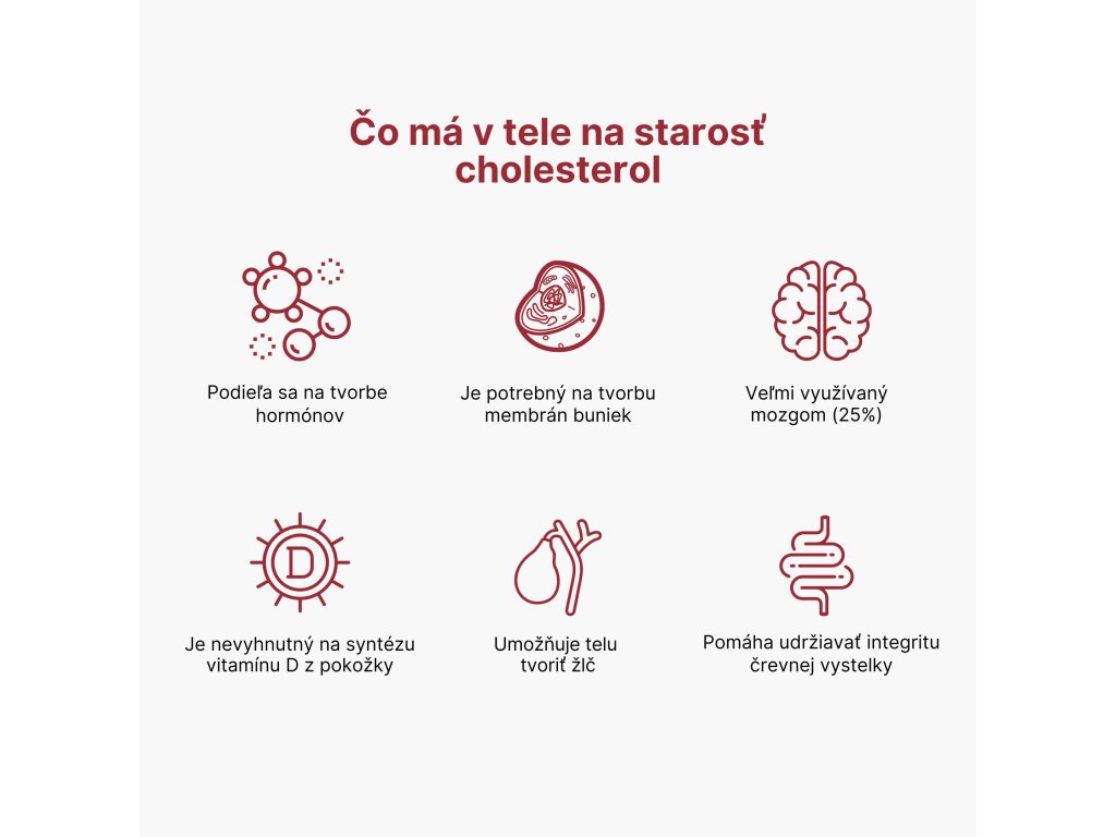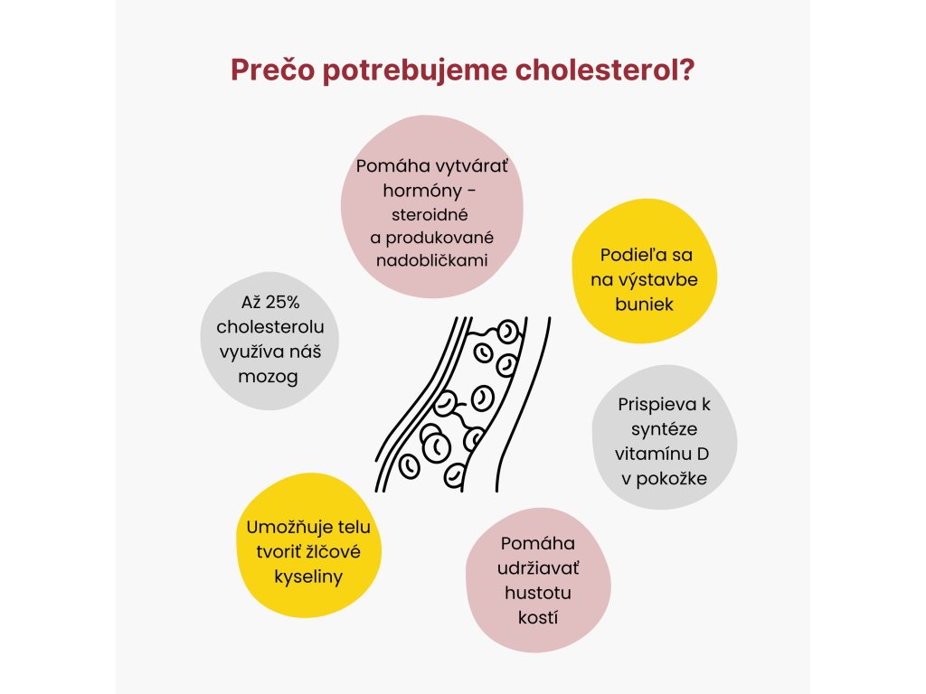Cholesterol je vosková látka, ktorú naše telo nevyhnutne potrebuje. Je transportovaný v krvi prostredníctvom častíc nazývaných lipoproteíny. Pečeň produkuje všetok cholesterol, ktorý telo potrebuje, a tiež sa stará o jeho odbúravanie. Cholesterol je nevyhnutný pre správnu tvorbu hormónov, zdravie obehového systému a mozgu. Jeho nedostatok môže viesť k zníženiu kognitívnych schopností a negatívne ovplyvniť zdravie neurónov.