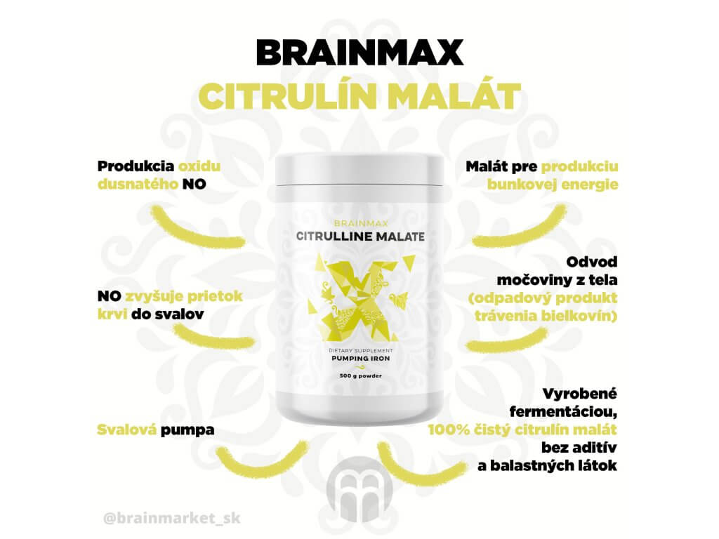 BrainMax Citrulín Malát 500g obsahuje neesenciálnu aminokyselinu, ktorej hlavnou výhodou je podpora tvorby oxidu dusnatého. Oxid dusnatý, známy aj ako NO, hrá kľúčovú úlohu pri vazodilatácii, čo je rozšírenie ciev. Tento proces zvyšuje prietok krvi v cievach, čo v konečnom dôsledku vedie k lepšiemu prekrveniu a napumpovaniu svalov, čím sa zlepšuje aj prívod živín do tkanív. Okrem toho, citrulín spolu s arginínom a ornitínom hrá hlavnú úlohu v močovinovom cykle, ktorý je metabolickým procesom premenu amoniaku na močovinu, ktorá je potom vylučovaná z tela ako odpadový produkt trávenia bielkovín.