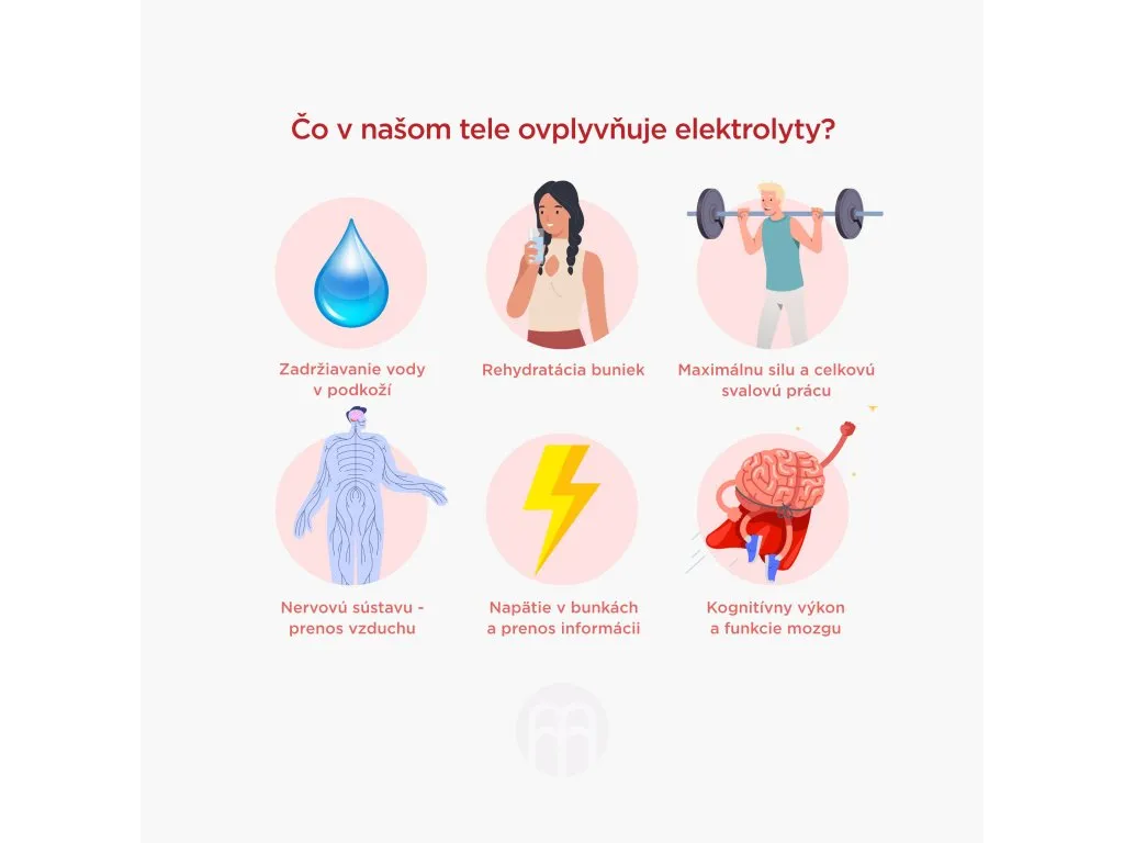 Ako elektrolyty označujeme minerály, ktoré v sebe nesú kladný alebo záporný elektrický náboj (ióny). Sú vo všetkých našich telesných tekutinách, tkanivách a bunkách. Svoj názov si elektrolyty vyslúžili, pretože sú zodpovedné za prenos elektrických impulzov medzi bunkami. Elektrolyty oceníte po tréningu, na výstupe alebo pri akejkoľvek pohybovej aktivite. Dodajú energiu, regulujú krvný tlak, podieľajú sa na rehydratácii buniek, podporujú silu a prácu svalov, podieľajú sa na prenose vzruchu v nervovej sústave, na práci mozgu, regulujú hladinu vody v tele a tým zabraňujú dehydratácii alebo naopak minimalizujú zadržiavanie vody v tele.