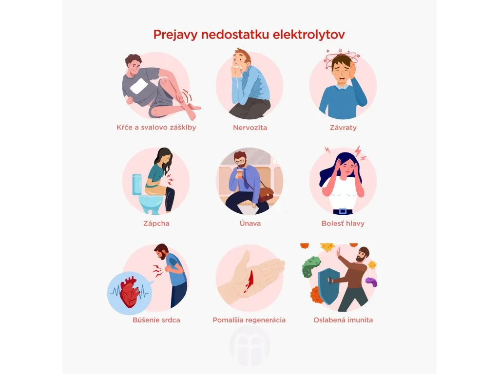 Nízky obsah elektrolytov môže byť spôsobený stresom, konzumáciou alkoholu, fyzickou aktivitou, potením alebo užívaním niektorých liekov. Tento stav môže následne viesť ku kŕčom, svalovým zášklbom, nervozite, závratom, zápche, svalovej slabosti, bolestiam hlavy, búšeniu srdca, oslabenej imunite, únave a pomalšej regenerácii. Dôležitá nie je len prítomnosť elektrolytov, ale aj ich vzájomný pomer.