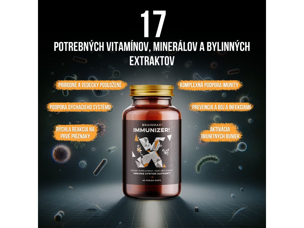 BrainMax IMMUNIZER obsahuje 17 prírodných a vedecky overených látok na podporu imunity. Pôsobí ako prevencia a zároveň pomáha pri boji s prechladnutím a infekciou. Jeho komplexné zloženie podporuje imunitu, dýchací systém, chráni bunky pred oxidatívnym stresom a aktivuje imunitné bunky. Všetky látky účinne spolupracujú pri prevencii aj liečbe akútneho prechladnutia. Dôležité je konať rýchlo už na začiatku prechladnutia.
