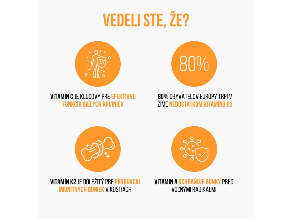 Vitamíny C, K2, D, A sú kľúčové vitamíny, podieľajúce sa na celkovej obranyschopnosti tela .