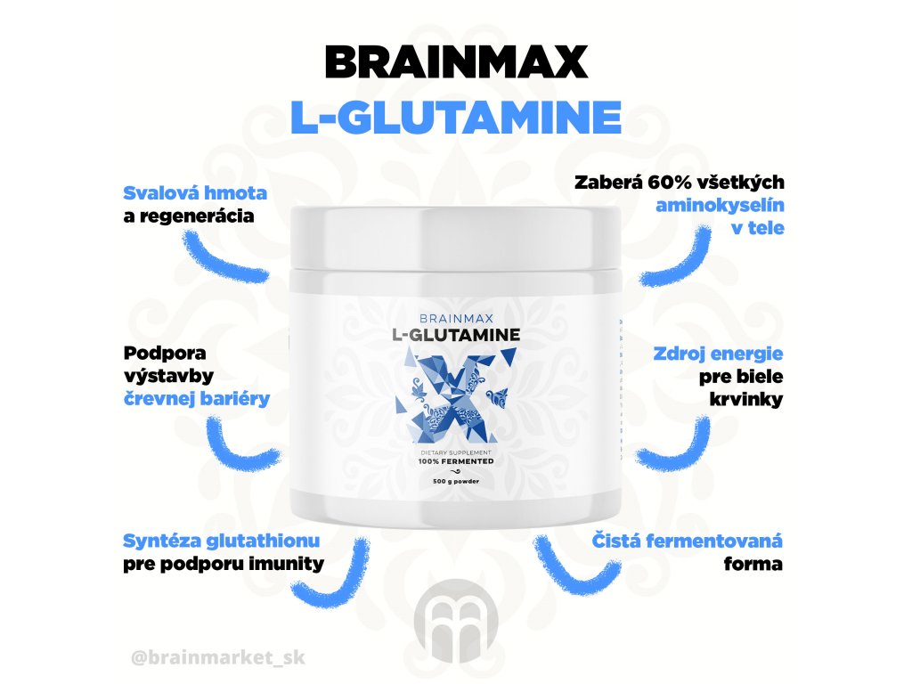 BrainMax L-Glutamine je najzastúpenejšou aminokyselinou v tele, ktorá slúži ako základný stavebný kameň bielkovín. V kostrovom svalstve tvorí glutamín podiel 60% zo všetkých aminokyselín a slúži ako prostredník pre syntézu ďalších aminokyselín. Glutamín nie je síce esenciálnou aminokyselinou, pretože si ho telo vie vytvoriť samo, ale jeho spotreba je vplyvom tréningu či hektického životného štýlu vysoká a to so sebou nesie riziko odbúravania svalovej hmoty. Práve preto je glutamín veľmi obľúbeným doplnkom stravy pre športovcov. Glutamín sa vyskytuje vo všetkých bielkovinách prijímaných v jedle ako je červené mäso, mliečne výrobky, vajcia či strukoviny.