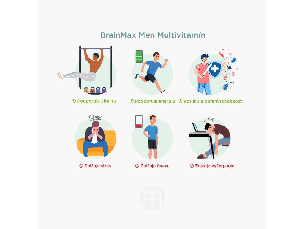Imunitný systém je váš nepretržitý ochranný štít pred baktériami, vírusmi a parazitmi. Bez funkčného imunitného systému by sme boli zraniteľní voči týmto hrozbám. Pre jeho posilnenie sú dôležité vitamíny a minerály, ktoré náš organizmus nevie vytvoriť. BrainMax Men Multivitamín obsahuje kľúčové látky podporujúce imunitu a obranyschopnosť, vitalitu a zdravie reprodukčného systému.