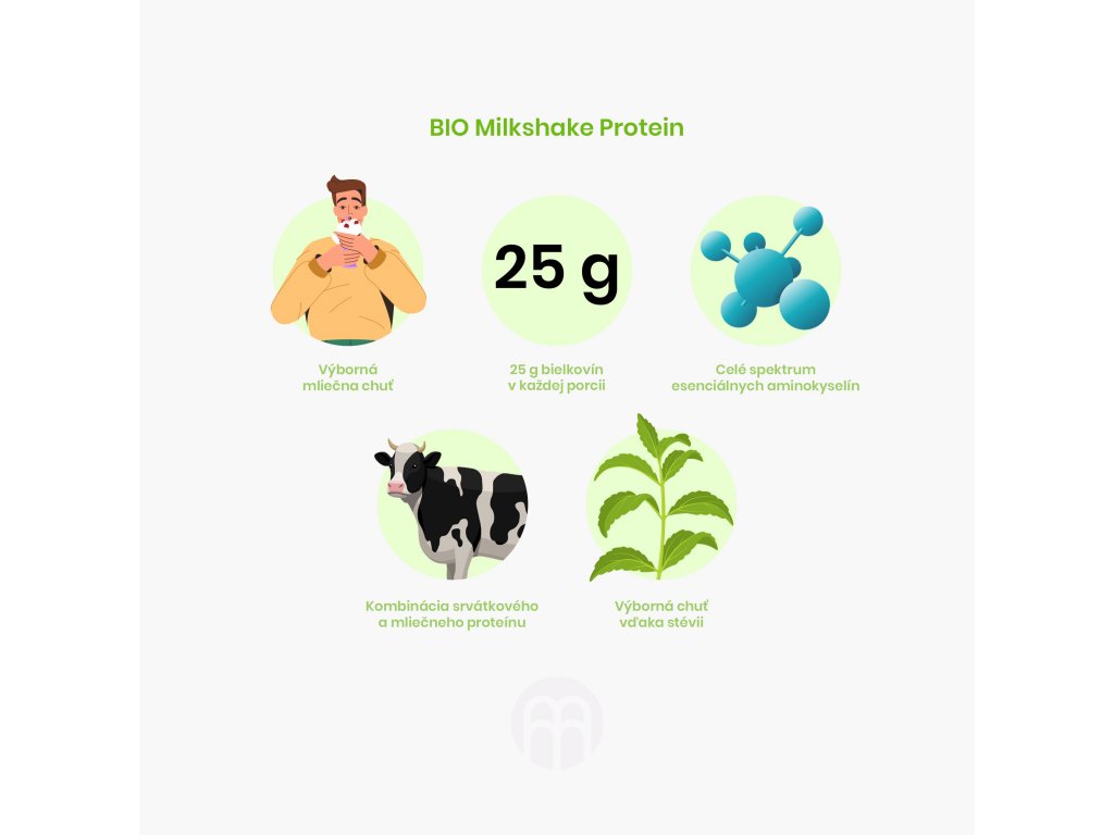 Kombinácia BIO srvátkového a BIO mliečneho proteínu zaistí celé spektrum aminokyselín v ideálnom pomere, čo zaisťuje výbornú využiteľnosť bielkovín svalovými bunkami. Milkshake obsahuje BIO mliečny a srvátkový proteínový koncentrát . Srvátka je jedným z najlepších zdrojov živočíšnych bielkovín, pretože má vysoký obsah aminokyselín (5,5 g BCAA na dávku), je rýchlo stráviteľná a pomáha svalom rýchlejšie regenerovať. Vďaka vyššiemu množstvu tuku a čistého zloženia bez umelých aróm má vynikajúcu chuť a ľahkú napenenú konzistenciu.