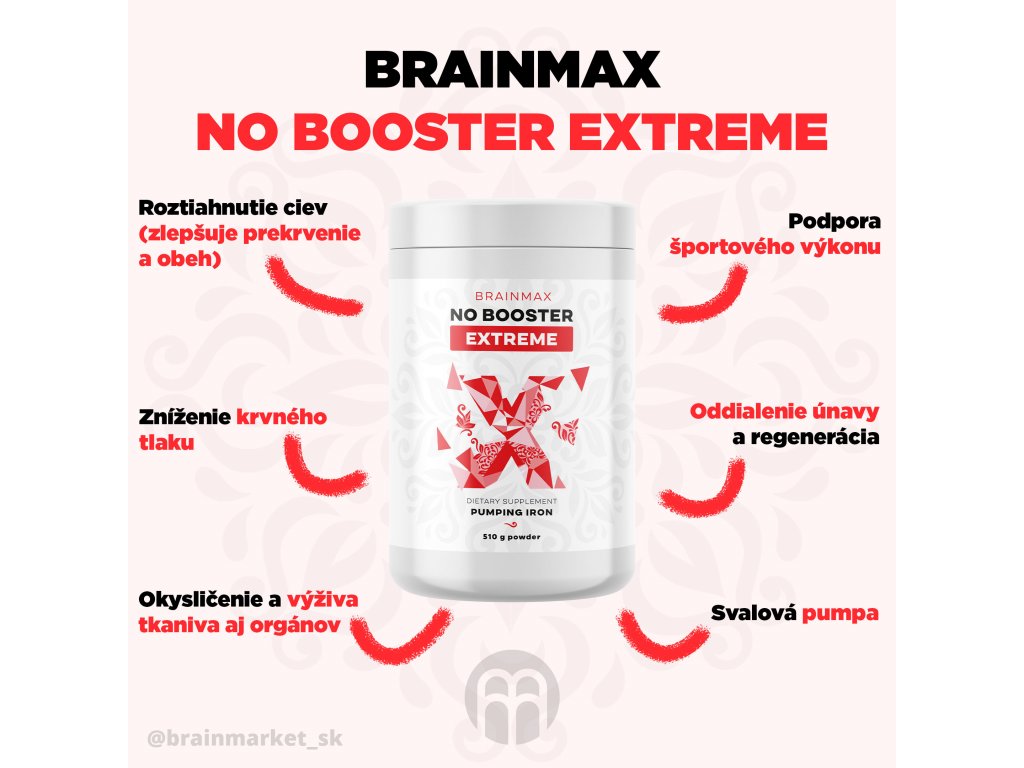 BrainMax NO Booster Extremeje komplex troch aminokyselín vo stabilných a lepšie využiteľných formách pre telo, ktoré má za cieľ stimulovať produkciu oxidu dusnatého v organizme. Obsahuje arginín vo forme alfaketoglutarátu AAKG, citrulín vo forme malátu a ornitín vo forme alfaketoglutarátu OKG. Tento výkonný komplex nie je určený len pre športovcov a kulturistov, aby podporil svalovú pumpu, ale aj pre tých, ktorí sa snažia optimalizovať krvný tlak, obeh krvi a celkovo zlepšiť prekrvenie orgánov. Táto kombinácia má jasný cieľ: Navýšiť hladinu oxidu dusnatého v tele a priniesť pre užívateľov maximálne výhody spojené so zvýšenou hladinou oxidu dusnatého.