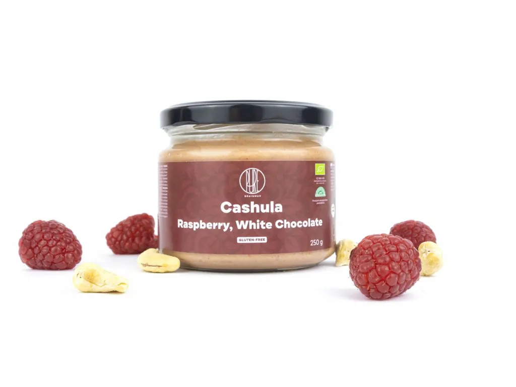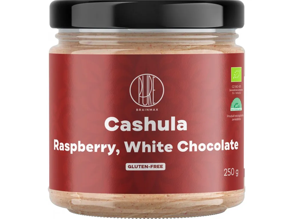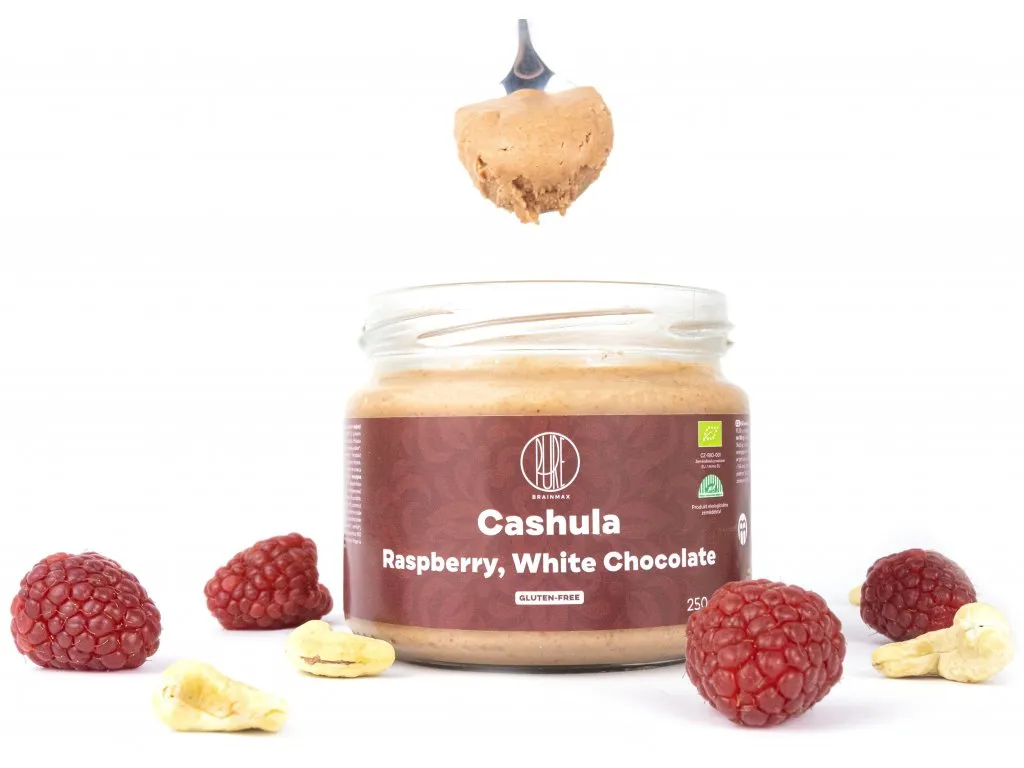 BrainMax Pure Cashula tvorí kešu oriešky v BIO kvalite ku ktorým sme pridali BIO bielu čokoládu a lyofilizované maliny. Má krémovú konzistenciu a vynikajúcu chuť.