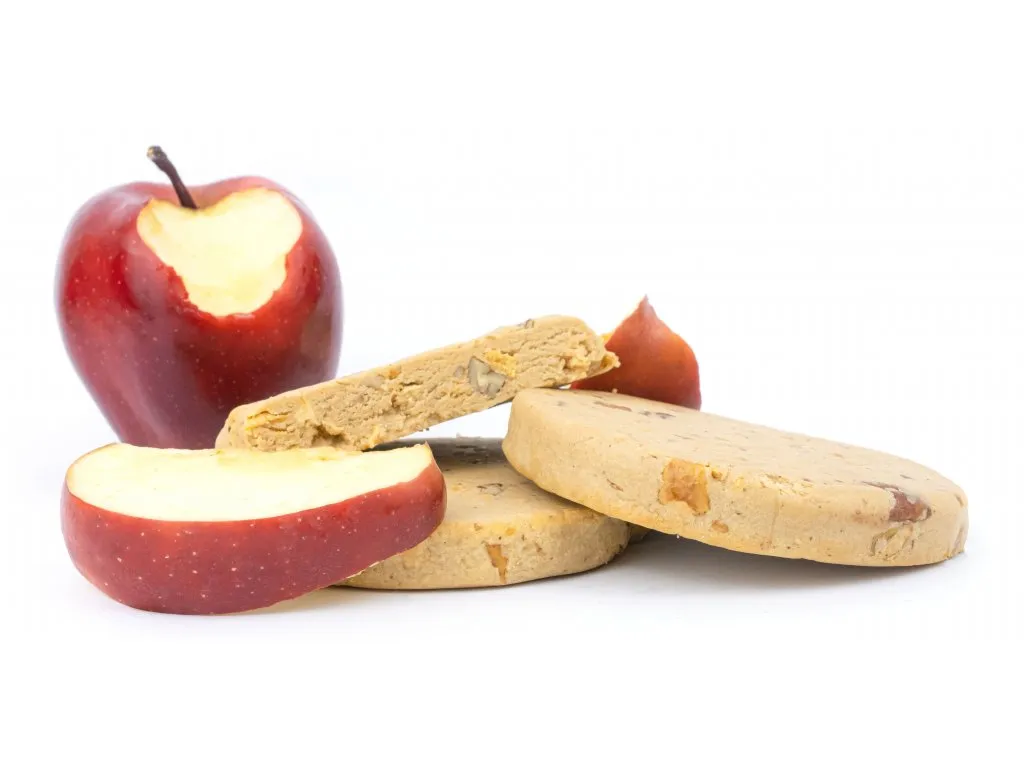 Proteínová sušienka vyrobená z BIO srvátkového a BIO mliečneho proteínu. Každá sušienka obsahuje 12 g bielkovín na 100 g. Pri výrobe bola použitá BIO mandľová múka, ktorá je prirodzene bezlepková, a sušienka je celá bezlepková. Na dosladenie sme použili inulín, prebiotickú vlákninu so sladkastou chuťou. Sušienka je mäkká a vláčna s neodolateľnou chuťou jabĺk, javorového sirupu a kúskami chrumkavých vlašských orechov.