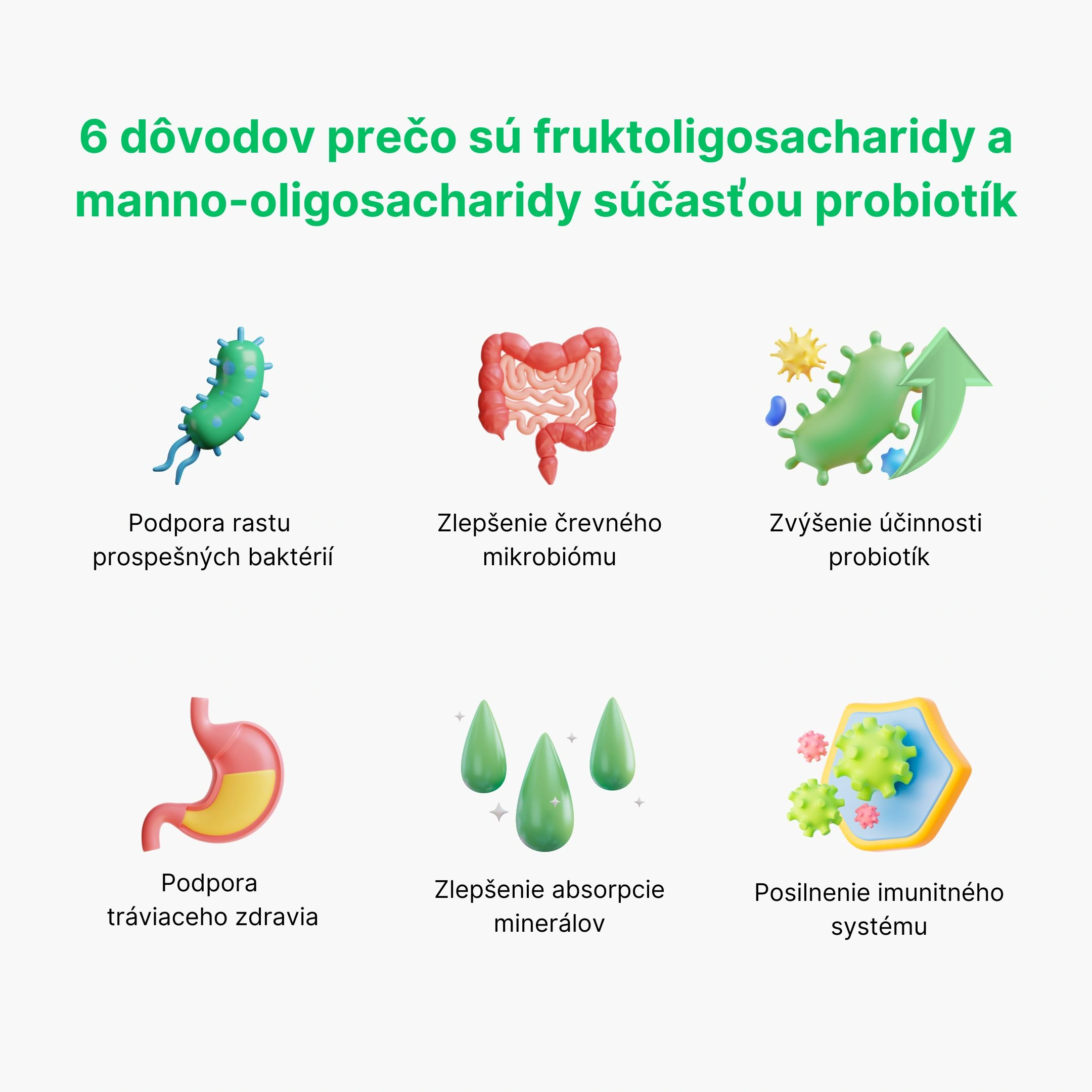 Probiotiká a prebiotiká, ako sú FOS (fruktooligosacharidy) z inulínu a MOS (manno-oligosacharidy) z kvasinkového extraktu, podporujú zdravie črevnej mikroflóry. FOS a MOS slúžia ako potrava pre prospešné baktérie a zlepšujú podmienky pre probiotický kmeň Saccharomyces boulardii. Kombinácia FOS a MOS znižuje pH v tráviacom trakte a obmedzuje rast škodlivých mikroorganizmov, čím vytvára priaznivé prostredie pre rast probiotík a efektívnejšie spracovanie živín.