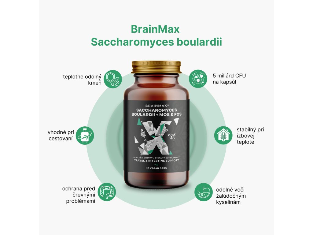 BrainMax Saccharomyces boulardii je kmeň probiotických kvasiniek, ktorý je vďaka svojej teplotnej stabilite vhodný na použitie v rôznych klimatických podmienkach a nevyžaduje zvláštne skladovacie podmienky. Tento kmeň je vynikajúcou voľbou pri cestovaní do iných klimatických pásiem a pri črevných problémoch. Jedna kapsula denne zabezpečuje 5 miliárd živých organizmov spolu s fruktooligosacharidmi a manno-oligosacharidmi, ktoré posilňujú probiotické účinky.