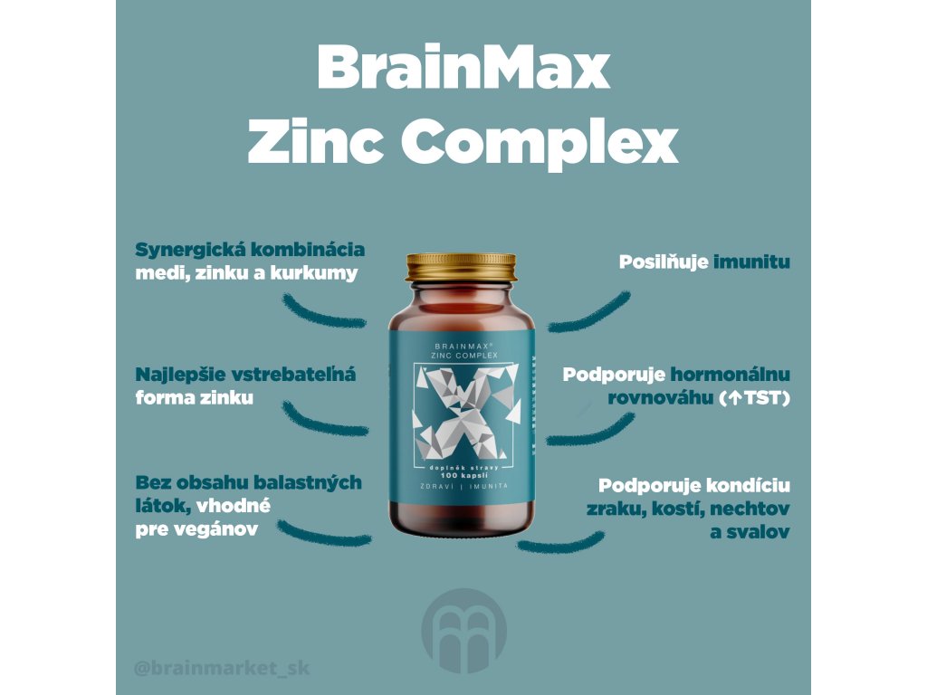 BrainMax Zinc Complex predstavuje unikátnu synergickú kombináciu zinku, selénu, medi a biologickej kurkumy, vyvinutú na podporu imunity, hormonálnej rovnováhy (zvýšenie hladiny testosterónu), plodnosti, zdravia kostí, vlasov, nechtov a pokožky, ako aj na zníženie zápalových procesov a ochranu buniek pred oxidatívnym stresom.